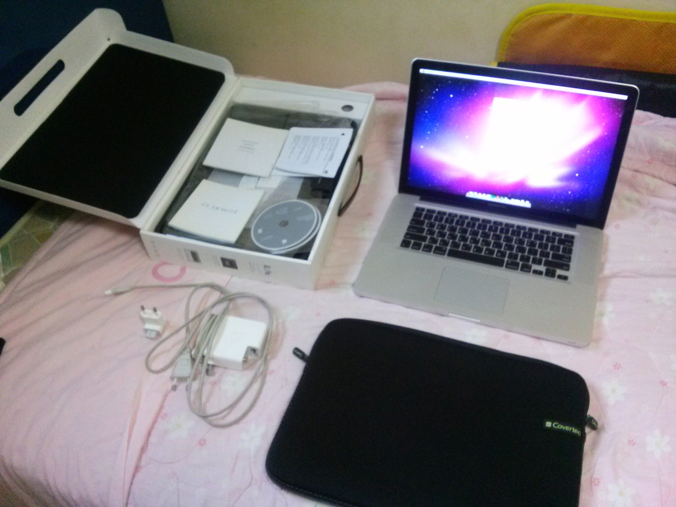 박스와 설치시디(스노우레오파드) 있습니다. 파우치와 가지고 있는 마이크로소프트 마우스 도 같이 드립니다.