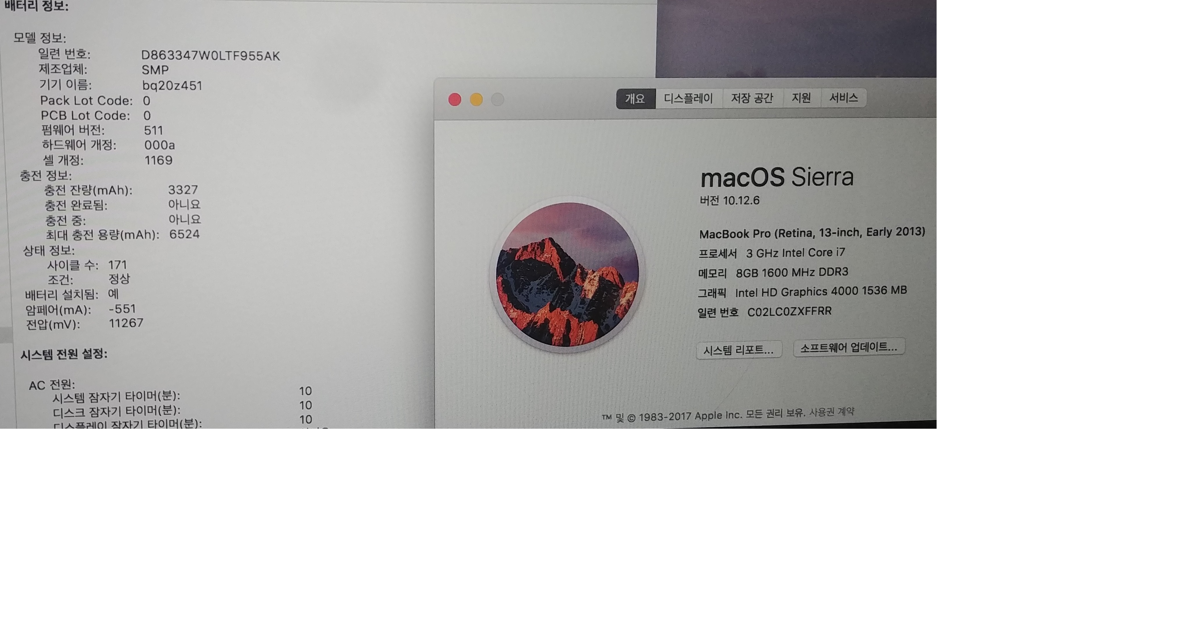 배터리 사이클 171  최대충전용량 6524