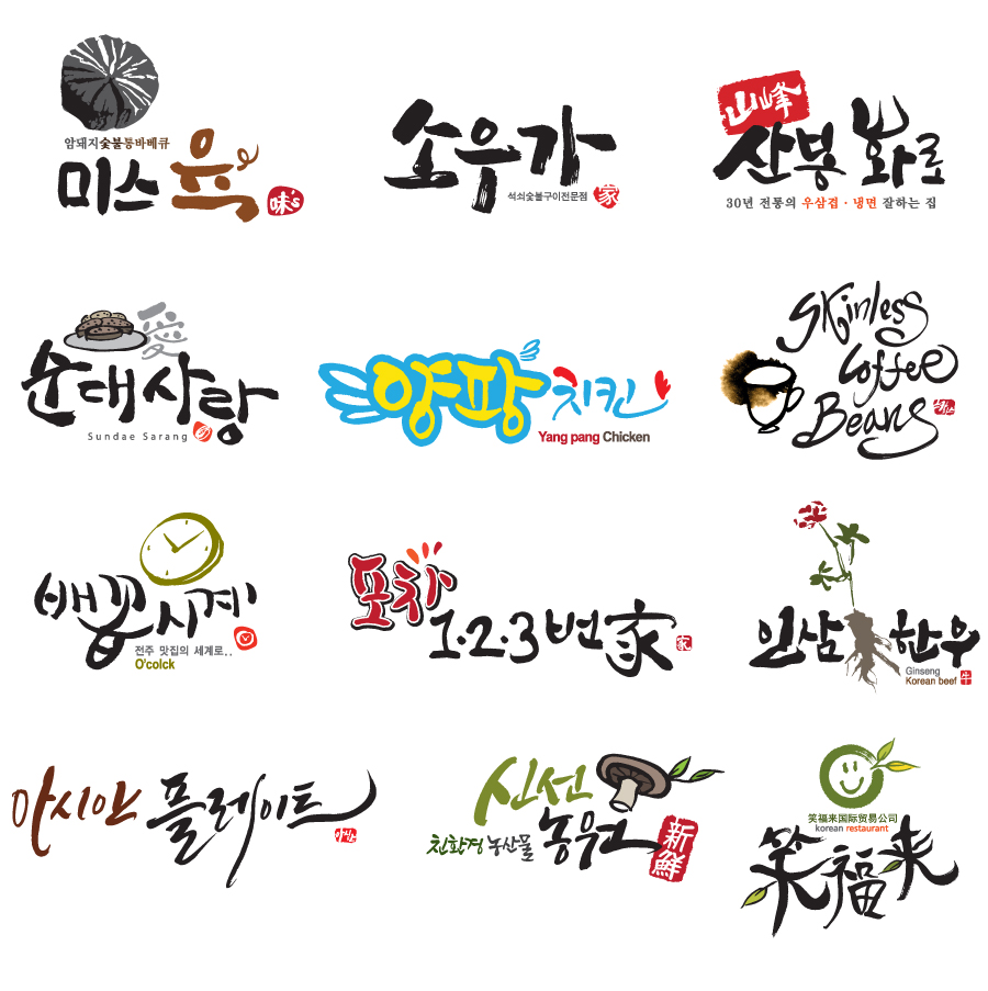 캘리그라피로 만든 다양한 음식점, 식품업계 간판/로고작업