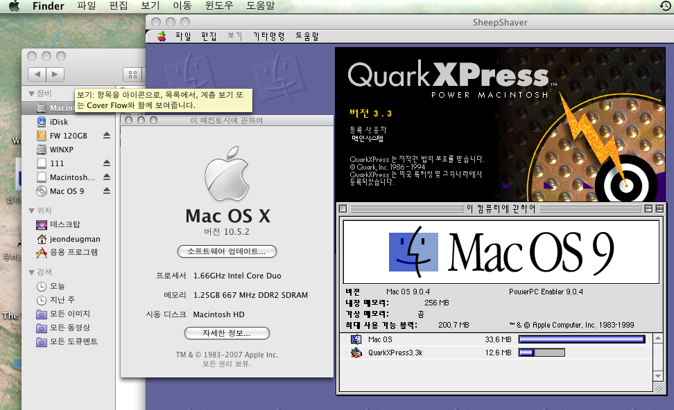 영문시스템에서 한글판 쿼억 돌아갑니다 ^^ 영문시스템에서 테스트 했습니다 이거 굳이 인텔맥 아니라도 됩니다 파워맥도 10.5 설치하면 클래식 사용못합니다 그래서 파워맥에서도 테스트 해보았는데 속도는 그럭저럭 나옵니다 하지만 작업을 하기에는 ^^ 한글시스템 9.0.4좀 빌릴수 있을까요? (이거 원래안되는거지만 ) 구하기 힘들어서요 테스트를 해봐야 하거든요 ^^ 그래야 주위에 혹시라도 사용하실분들 있으면 알려 줘야 해서요