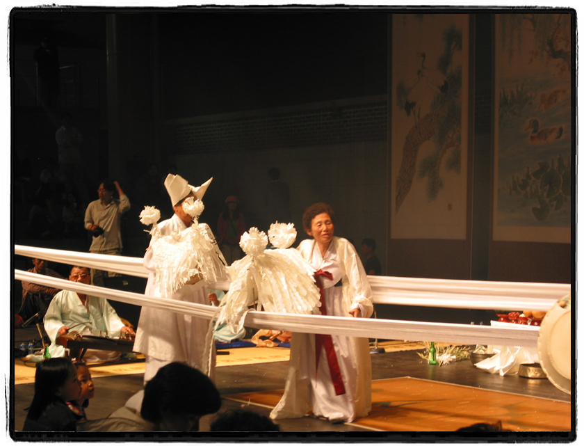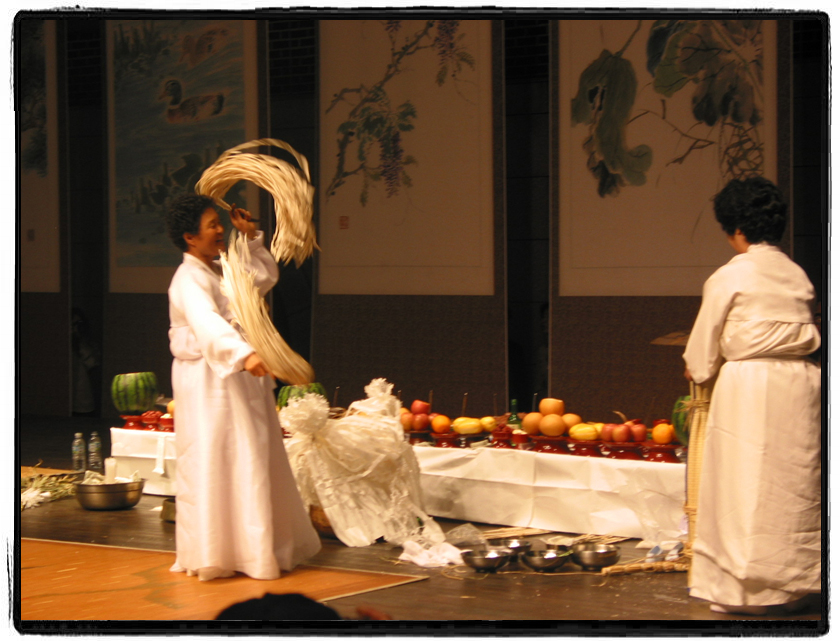 초등학교 5학년때.... 우연히 집 옥상에 올라갔는데 2집 건너편에서 사람들이 웅성웅성모여있고 꽹과리 소리와 함께 하얀 소복을 입은 아줌마는 무릎꿇고 손바닥을 비비며 기도하고 있고 그 앞에 색동옷입고 꿩꼬리털 2개를 꽂은 갓을 쓰고 양손에 시퍼렇고 커다란 식칼2개를 들고 제자리를 폴딱 폴딱 뛰면서 "어~ 허~ 어, 어~ 허~ 어"그러면서 그 식칼을 하얀소복입은 아줌마양쪽 목에 달랑말랑 하면서 칼을 휘둘러대는 것을 보았습니다. 정말 무섭더이다.. 그 어린시절 그장면은 충격이었소..  음메 무신거~