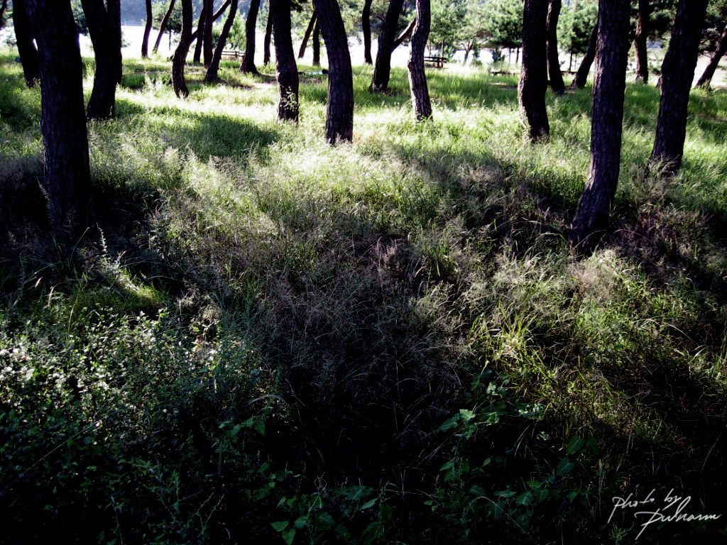 서녘으로 기울기 시작하는 햇빛때문에 무성한 풀밭으로 길게 늘어지는 소나무의 그림자가 멋져 보여서