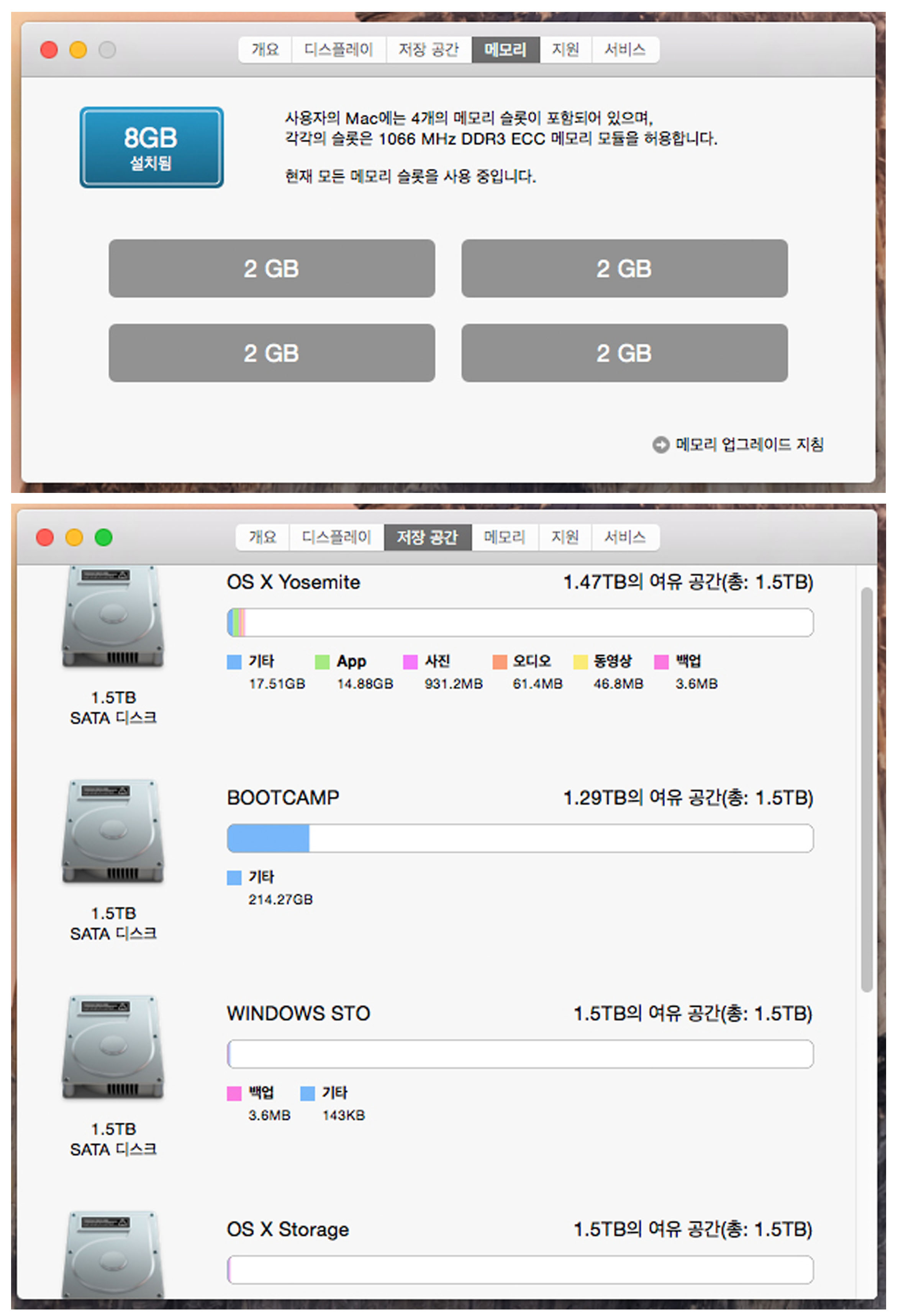 현재 맥OSX요세미티와 윈도우즈7 64bit부트캠프가 설치되어 있습니다.