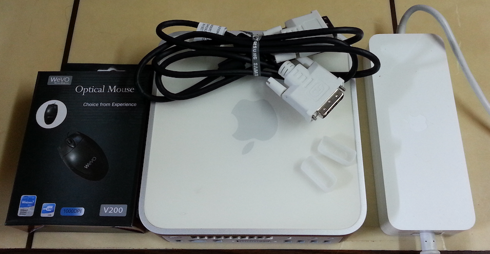 애플정품전원어댑터와 마우스와 모니터연결케이블과 맥미니본체입니다