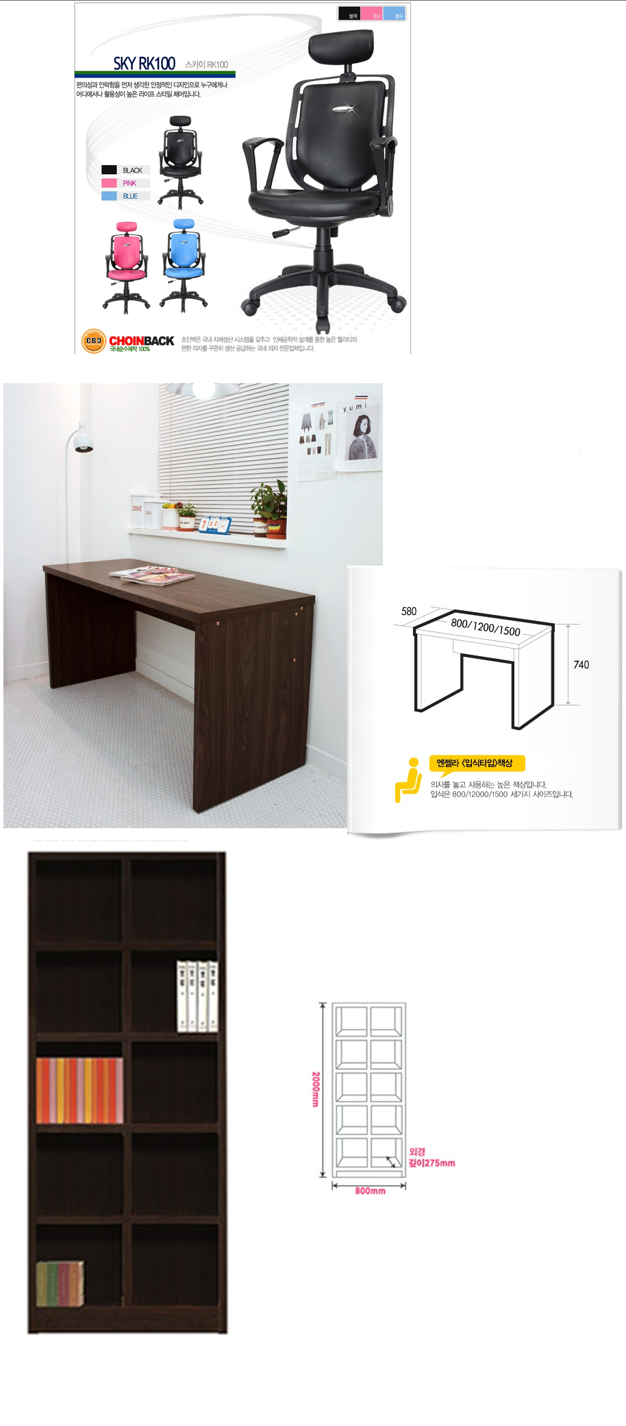 의자1개 / 책상 3개(1200짜리1개,1500짜리2개) / 책장1개 있습니다