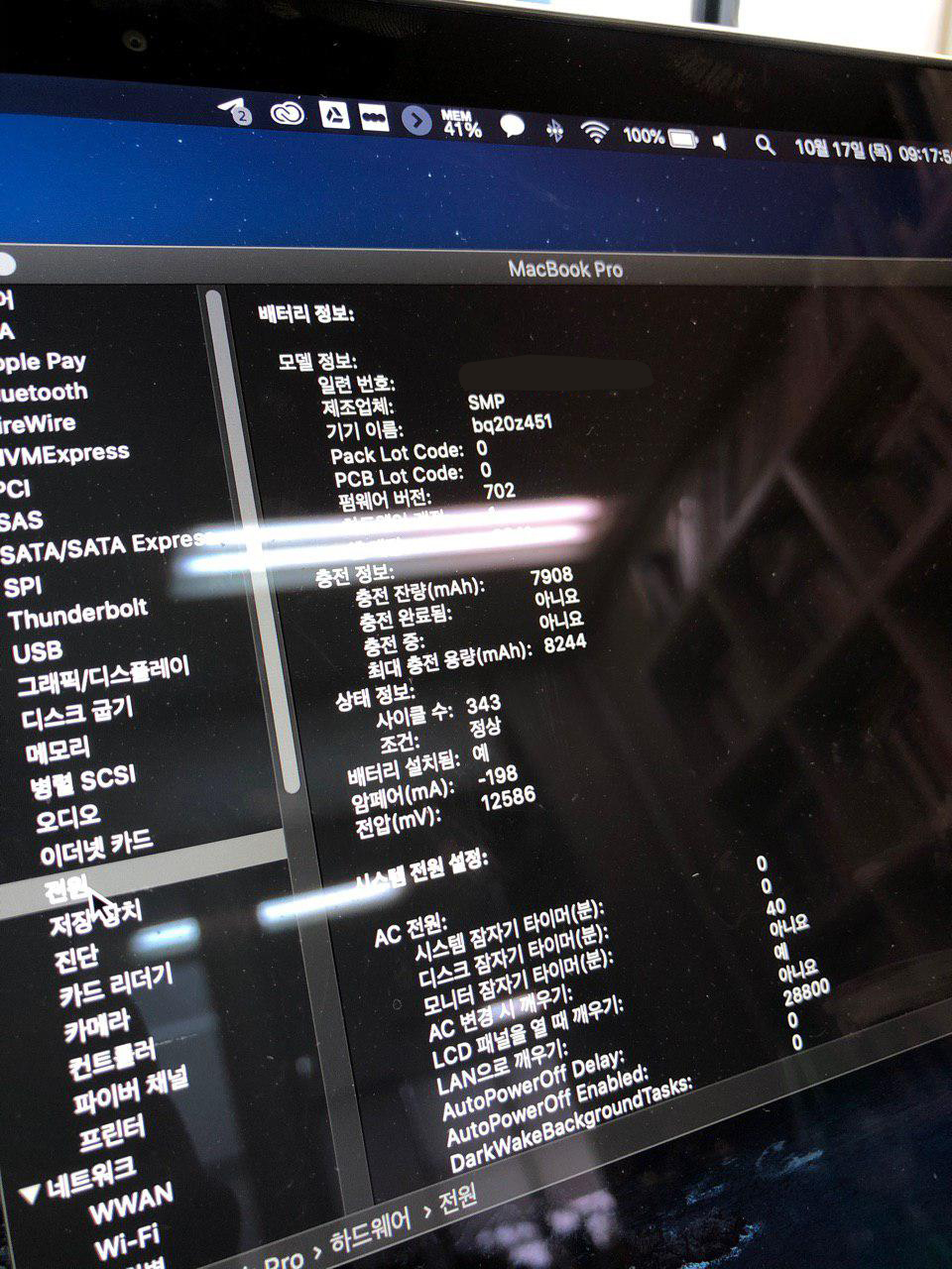 스펙이랑 사이클수(343)랑 배터리 상태 표시부분이랑 눌린부분이랑 사진 첨부합니다.