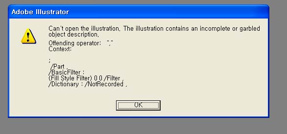emoticon_096 일러스트 파일자체에 손상이 생긴듯합니다. 방법은 현재 사용하는 일러스트 버전보다 상위에서 열어보시거나..아니면 코렐드로우 같은 프로그램에서 열기를 해보셔야 할듯합니다. ========= ★준도우미 A/S의 [자기 소개]를 마우스로 눌러보세요.