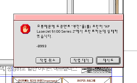 한글시스템안에 프리퍼런스 안에 Printing Pref 폴더와 데스크탑에 떠있는 프린터 아이콘을 버린후 선택자에서 adobe ps를 선택하고 우측에 프린터를 더블클릭해서 PPD셋팅을 다시 해보세요.