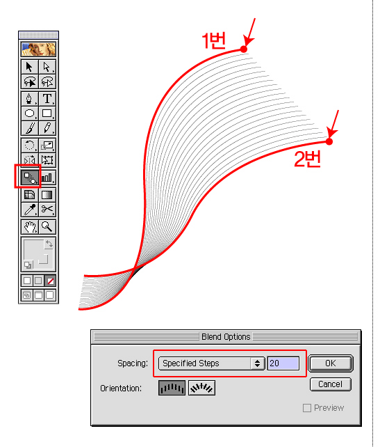 그다음. 툴바에 블렌드 툴을 클릭한다음